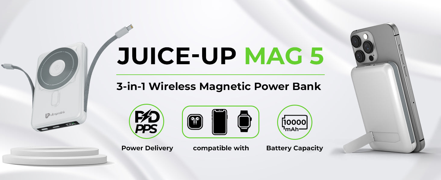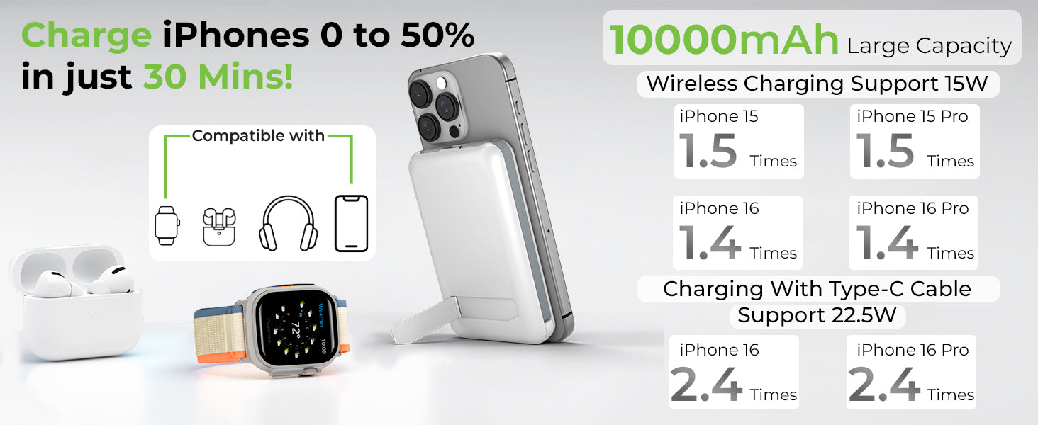 The 3-in-1 Magnetic Wireless Power Bank is the ultimate charging solution for iPhones, iWatch, AirPods, and more. Featuring Mag-Safe technology, it delivers 15W fast wireless charging for iPhone 16, 15, 14, and 13 series, ensuring a secure magnetic connection for uninterrupted power. It also supports 2.5W wireless charging for iWatch and 5W for AirPods, making it a must-have for all your iEssentials. With a high-capacity 10000mAh battery, this power bank provides multiple charges, keeping your devices powered throughout the day.