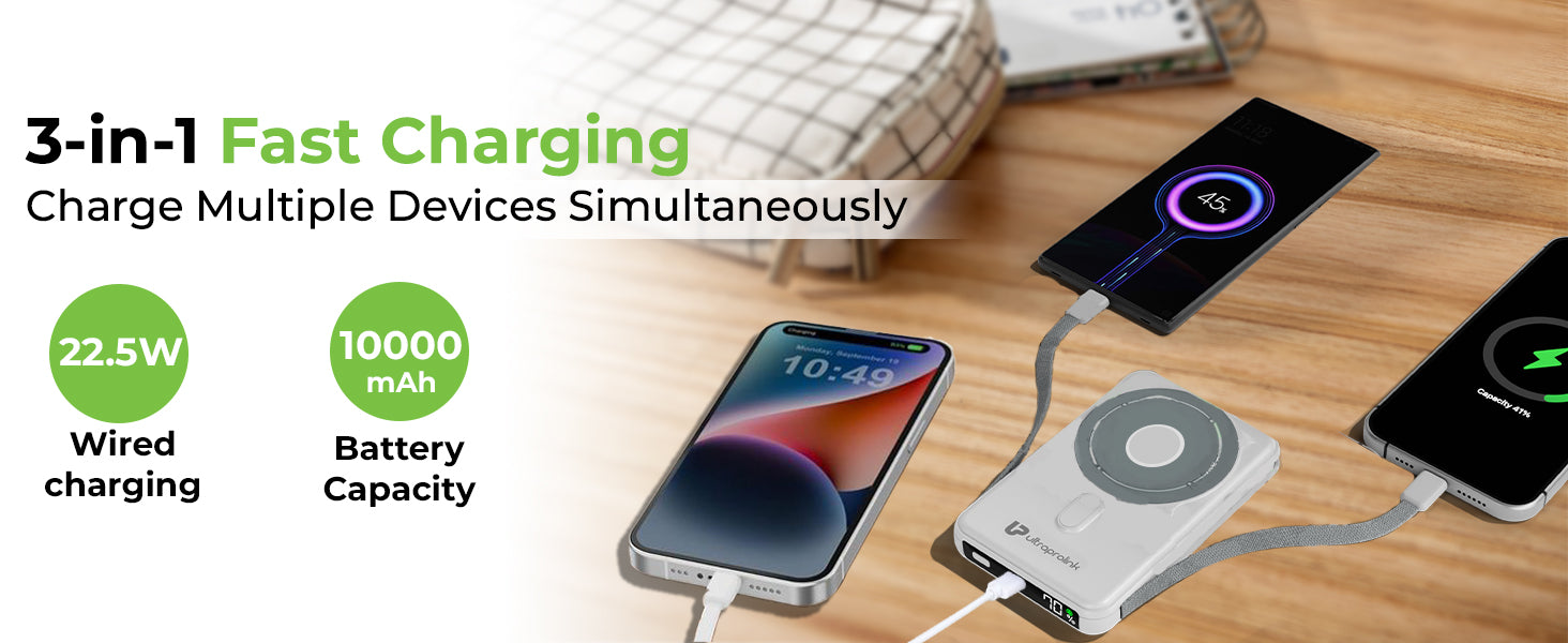 Equipped with a 10,000mAh / 38.5Wh battery, this power bank provides multiple charges for your devices. It can provide adequate back up for your iPhones, iWatch & Airpods + so many other gadgets which need cable charging, ensuring you stay powered throughout the day without worrying about running out of battery.