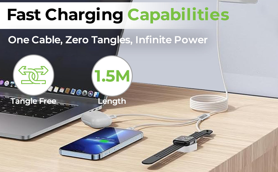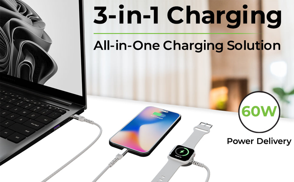 a) USB-C connector supports 60W PD for fast-charging compatible devices, including laptops, tablets, and smartphones like Macbooks, iPhones 15/16 series, iPads, Airpods & Flagship Android phones & Laptops as well. Remember to use with a 60W or higher PD charger. b) iPhone connector Provides 27W of power for older generation of iPhone 14 or earlier & ipads & other devices using the iPhone connector thereby reducing the time needed to reach a full charge. c) iWatch Pad provides a dedicated 2.5W magnetic charger built into the cable. No need for a separate charger; keeps your iWatch powered efficiently.