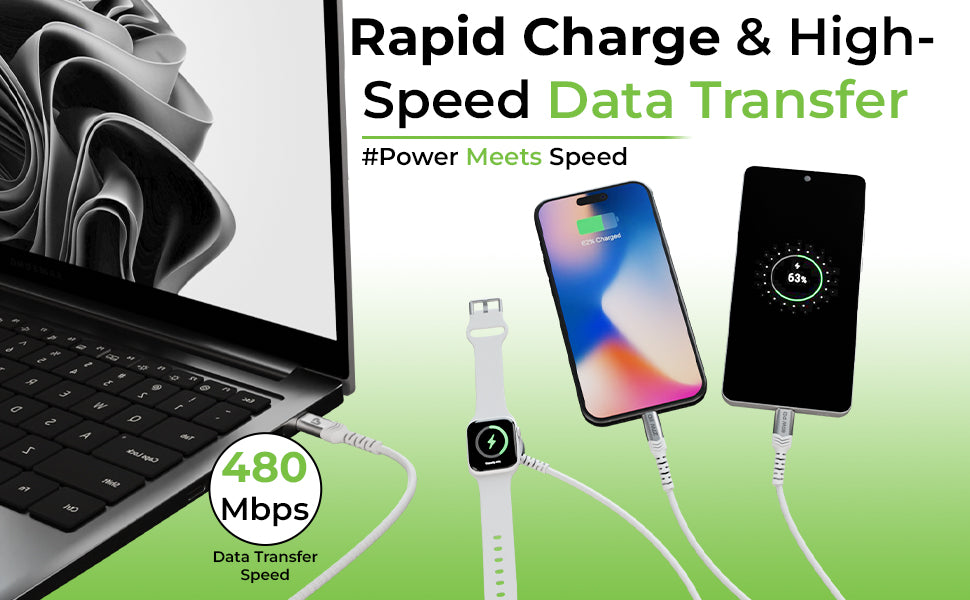 of upto 480Mbps via the USB-C and iPhone connectors. Enables quick file transfers, photo syncing, and seamless data sharing between devices.