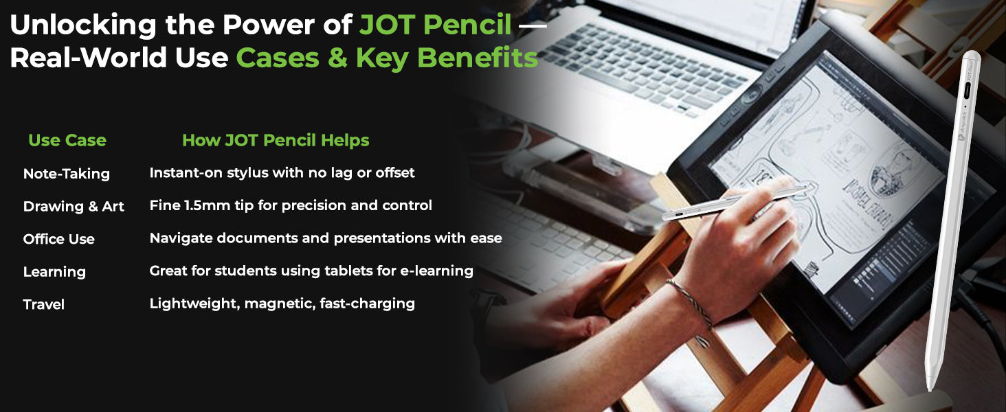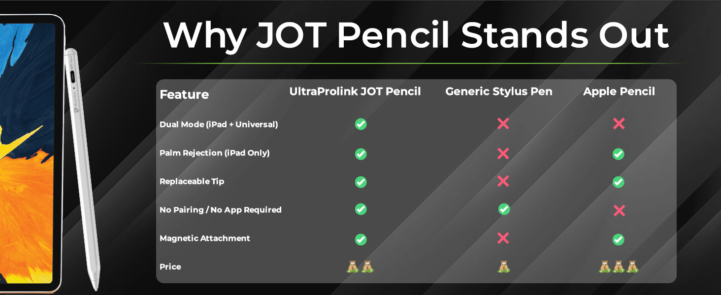 The UltraProlink JOT Pencil is the only stylus you need for your iPad, Android, or Windows touchscreen capacitive devices. Whether you're jotting down notes, sketching designs, or navigating on the go, the JOT Pencil delivers precision and comfort every time.