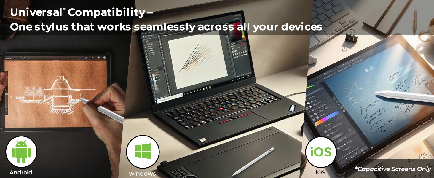 This unique stylus pen works universally with ios & android devices with capacitive screens. It works with multiple generations of iPads in one mode & universal tablets & phones in the other mode. It supports -iPad®Pro 12”/12.9”/11” (3rd to 7th Gen) / iPad®Air (3rd to 6th Gen) / iPad (6th-10th Gen) / iPad Mini (5th-7th Gen) / Samsung Galaxy Tab S9 FE / Samsung Galaxy Tab A9+ / Xiaomi Pad 7 / OnePlus Pad Go / Redmi Pad Pro / Honor Pad X9 / Lenovo Tab M11 / Realme Pad 2 /Pixel Tab Note: Not compatible with Microsoft Surface Devices & screens with electro-magnetic screens .