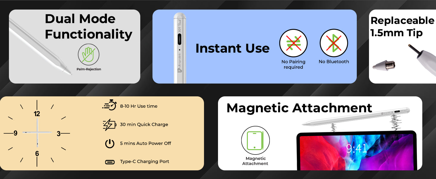 Made with a lightweight aluminium alloy body, it offers a premium feel and includes magnetic attachment for iPad users. With up to 10 hours of usage on a single 30-minute charge, plus an auto-sleep feature, it’s always ready when you are & offers a standby time of 90 days.