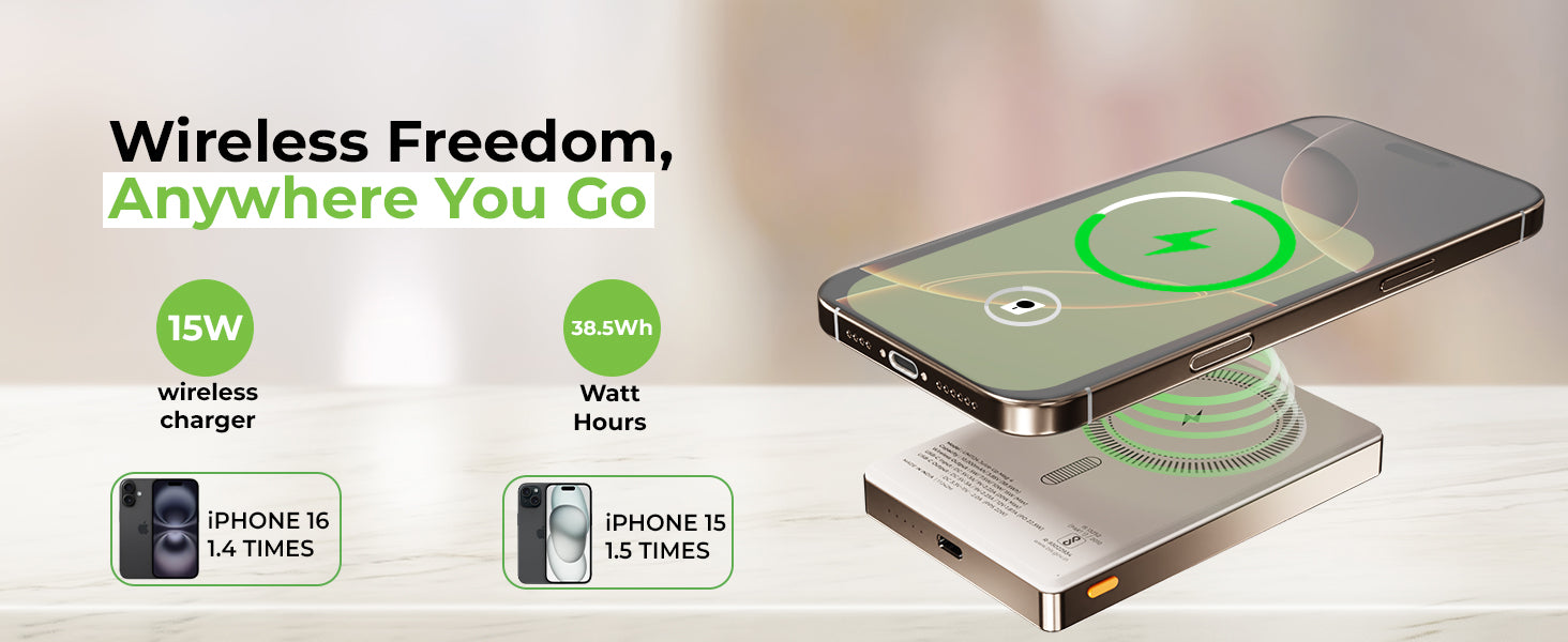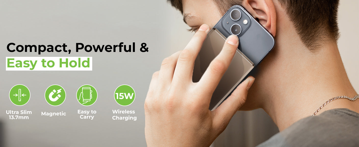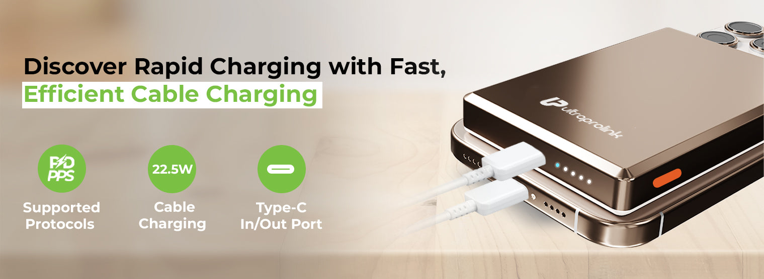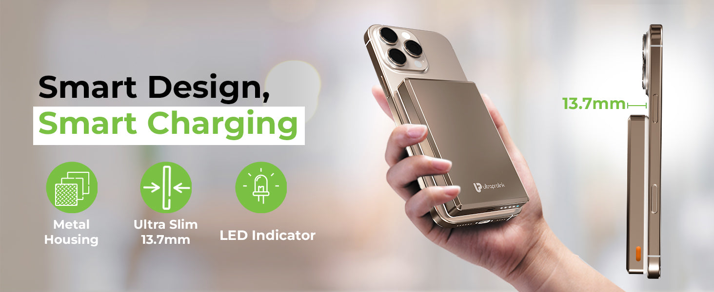 Elevate your wireless charging game with UltraProlink Juice-Up Mag 4, the ultimate Sleek Wireless Magnetic Power Bank for your new iPhone. With a 10000mAh capacity and 22.5W Type-C output, it supports PD & PPS protocols via cable charging & 15W wireless charging, ensuring rapid, efficient charging. 15W Mag-Safe compatibility for iPhone 16,15,14,13,12, and wireless charging for other devices like Samsung, OnePlus, and Google Pixel, make it incredibly versatile. Its ultra-Slim design (13.7mm) includes a premium brushed aluminium metal body, while the LED display keeps you informed of your power status. Portable and powerful, it’s perfect for on-the-go use. Proudly Made in India, this compact powerhouse comes with a 6-month warranty, ensuring quality and satisfaction. Charge your iPhone from 0% to 50% battery in 30 mins.