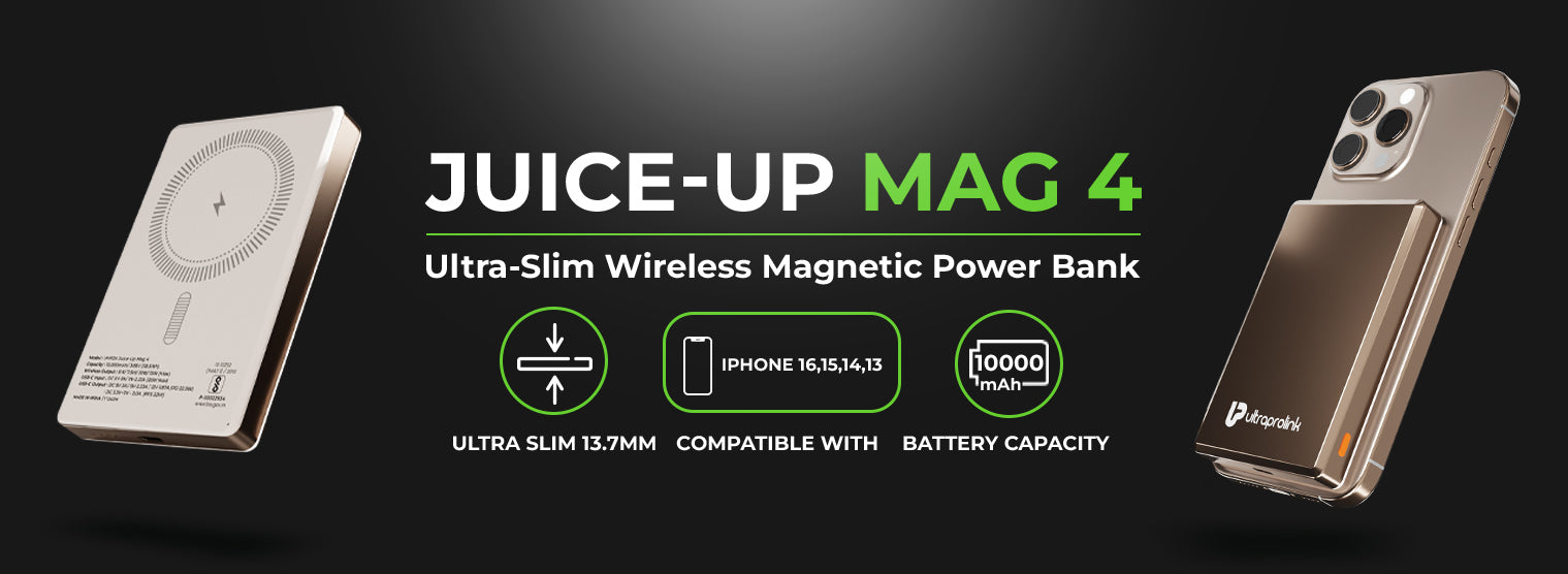 Elevate on-the-go charging with UltraProlink Juice-Up Mag 4, featuring ultra-slim magnetic wireless charging & a robust 10000mAh/38.5Wh battery. Perfect for iPhone 16,15,14,13 & other Qi-enabled devices. Enjoy endless power, anytime, anywhere.