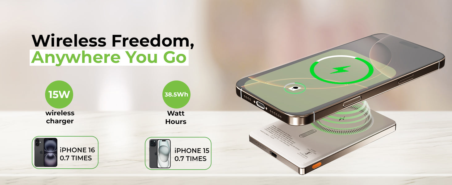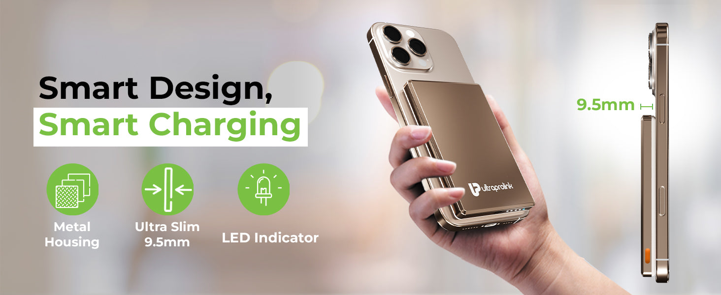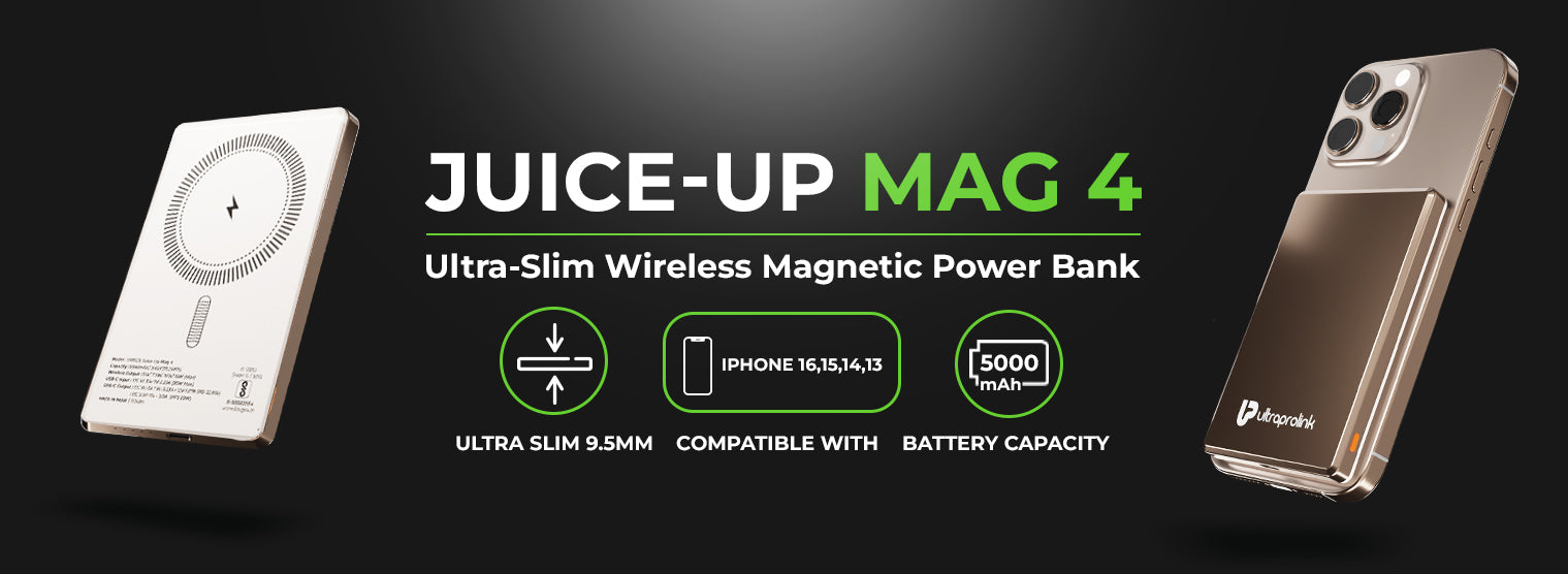 Elevate on-the-go charging with UltraProlink Juice-Up Mag 4, featuring ultra-slim magnetic wireless charging & a robust 5000mAh/19.25Wh battery. Perfect for iPhone 16,15,14,13 & other Qi-enabled devices. Enjoy endless power, anytime, anywhere..