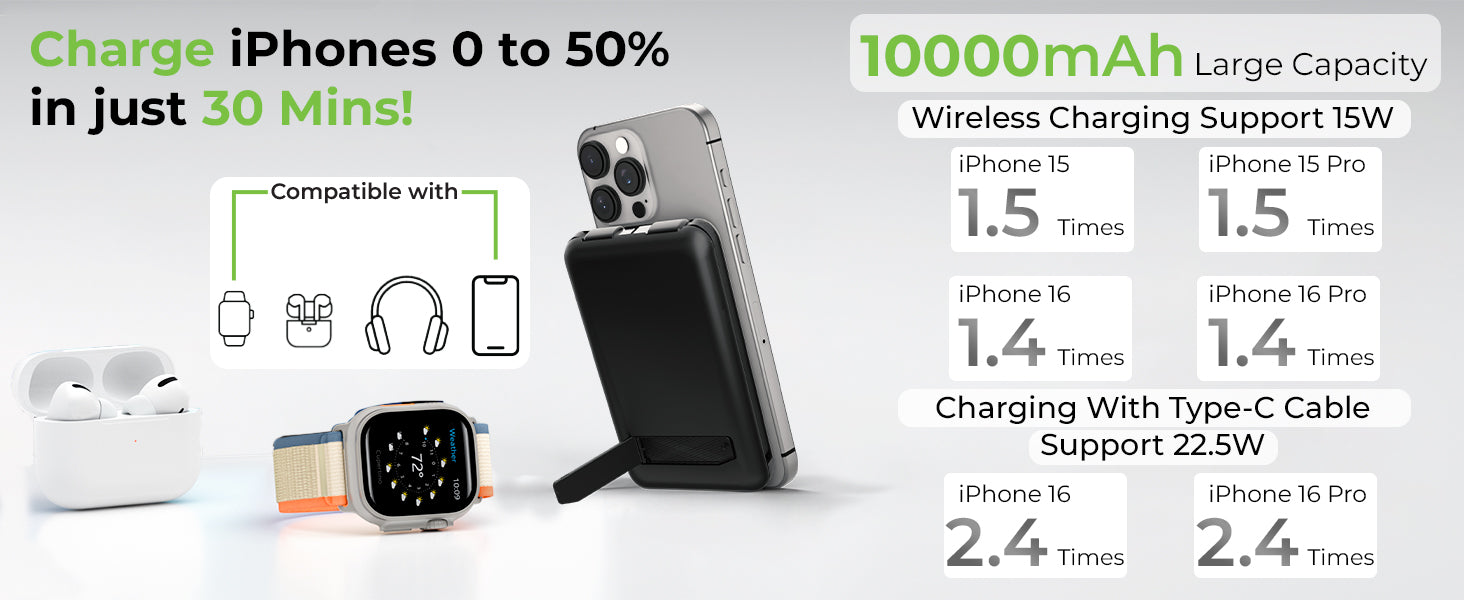 The 3-in-1 Magnetic Wireless Power Bank is the ultimate charging solution for iPhones, iWatch, AirPods, and more. Featuring Mag-Safe technology, it delivers 15W fast wireless charging for iPhone 16, 15, 14, and 13 series, ensuring a secure magnetic connection for uninterrupted power. It also supports 2.5W wireless charging for iWatch and 5W for AirPods, making it a must-have for all your iEssentials. With a high-capacity 10000mAh battery, this power bank provides multiple charges, keeping your devices powered throughout the day.