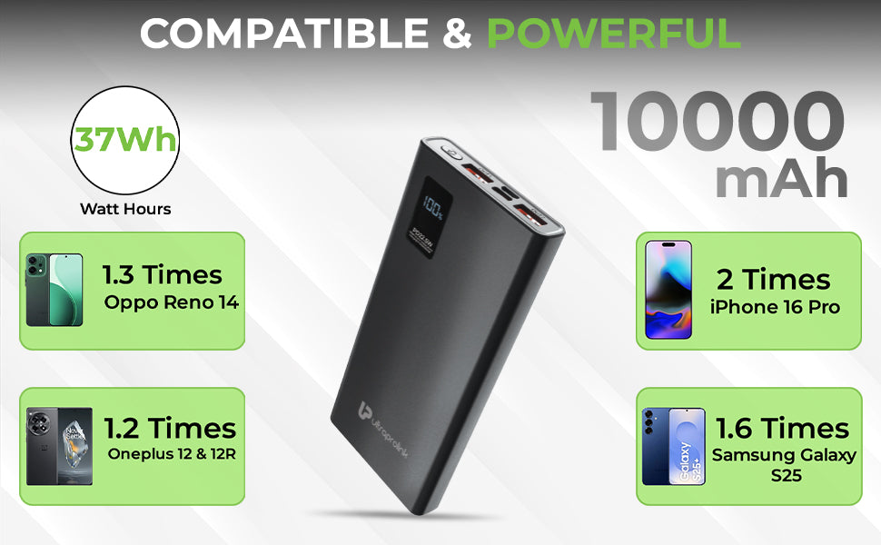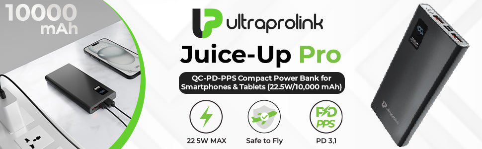 Introducing the UltraProlink Juice-Up Pro, a powerhouse of portable energy with a real 10000mAh battery capacity (37Wh) packed into a compact and convenient housing. Equipped with a USB-C PD3.0/PPS port (Max 22.5W), two QC3.0 USB-A port (Max 22.5W) and one Micro USB Port (Max 18W Input), this power bank is a versatile charging solution compatible with a range of devices, including iPhones, Samsung, Nothing, and Pixel Phones. The LCD battery level indicator, accompanied by a Wake-Up Button, keeps you informed about the power status. Proudly made in India and BIS certified, it comes with built-in safeguards, protecting your devices from excessive current, overheating, and overcharging. The Pass-Thru Charging feature allows simultaneous charging of the power bank and connected device. The package includes a USB charging cable and a manual, and the product is backed by a 6-month brand warranty, ensuring reliability and peace of mind for your charging needs.