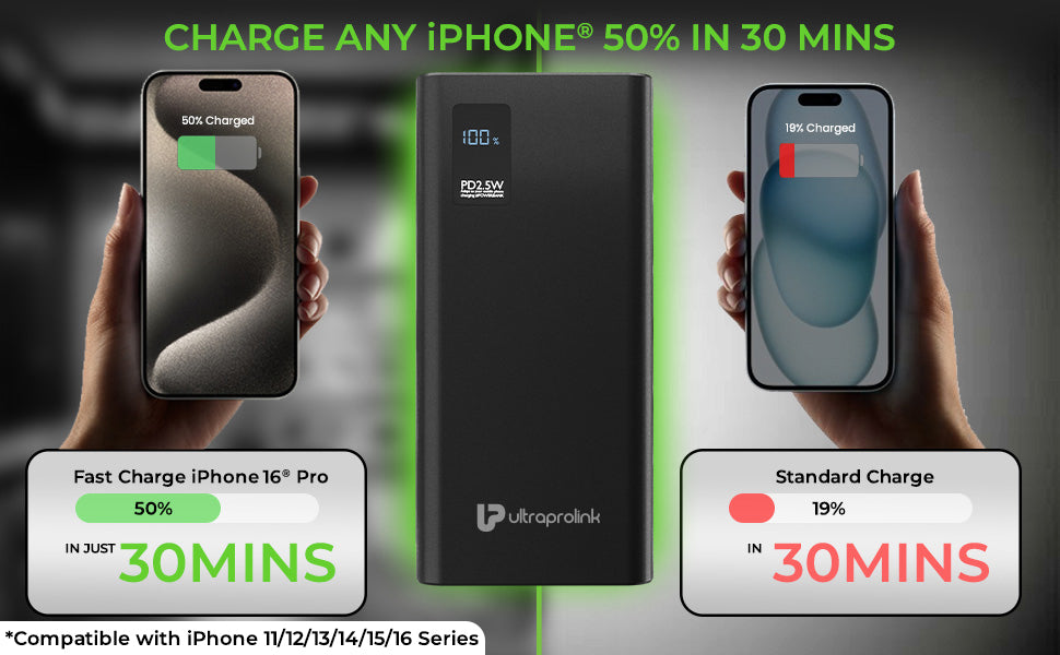 Charge any iPhone up to 50% in 30 minutes through the Type C PD port. Also Supports PPS 'Fast Charging' for Samsung phones. It's also designed to fast fuel a Nothing Phone or Pixel Series phones. The Type C port is both an input as well as an output port and can be used to fast charge the power bank as well.
