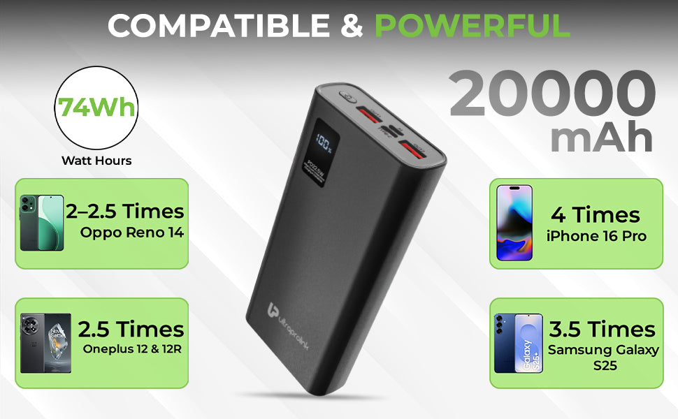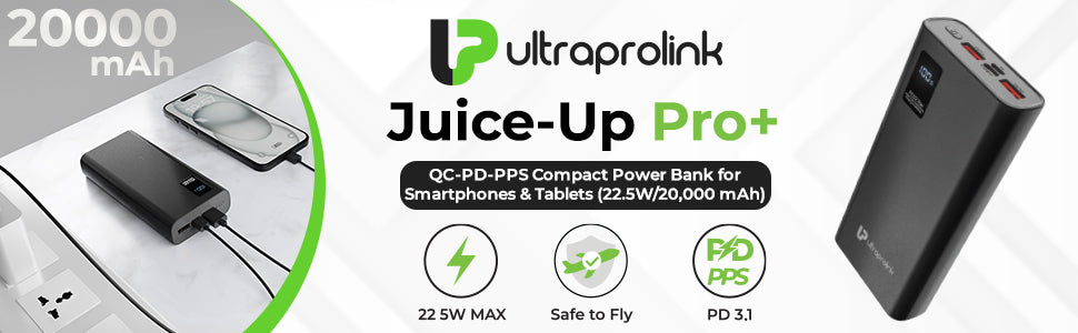 Introducing the UltraProlink Juice-Up Pro+, a powerhouse of portable energy with a real 20000mAh battery capacity (74Wh) packed into a compact and convenient housing. Equipped with a USB-C PD3.0/PPS port (Max 22.5W), two QC3.0 USB-A port (Max 22.5W) and one Micro USB Port (Max 18W Input), this power bank is a versatile charging solution compatible with a range of devices, including iPhones, Samsung, Nothing, and Pixel Phones. The LCD battery level indicator, accompanied by a Wake-Up Button, keeps you informed about the power status in real time. Proudly made in India and BIS certified, it comes with built-in safeguards, protecting your devices from excessive current, overheating, and overcharging. The Pass-Thru Charging feature allows simultaneous charging of the power bank and connected device. The package includes a USB charging cable and a manual, and the product is backed by a 6-month brand warranty, ensuring reliability and peace of mind for your charging needs.