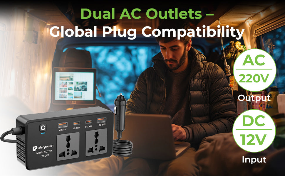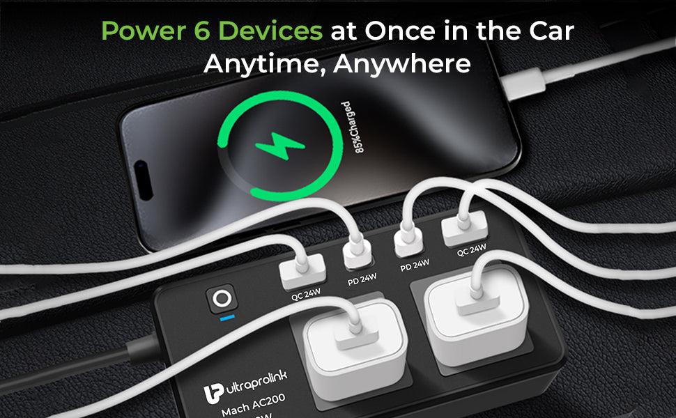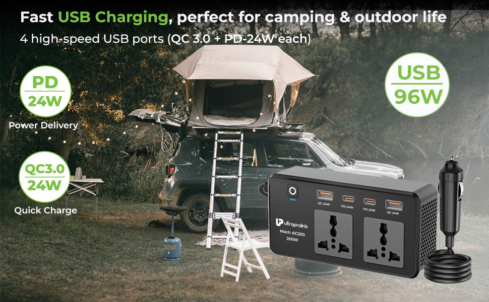 Stay powered up wherever you go with this UltraProlink Mach AC 200W - DC to AC Car Power Inverter, designed to charge up to 6 devices at once. It efficiently converts DC12V to AC220V, making it ideal for powering laptops, mobile devices, and small appliances on the road. The inverter includes two universal AC sockets (200W max), two USB-A Quick Charge 3.0 ports, and two USB-C Power Delivery ports, each delivering 24W—providing a total USB output of 96W even when all 4 ports are used simultaneouly.