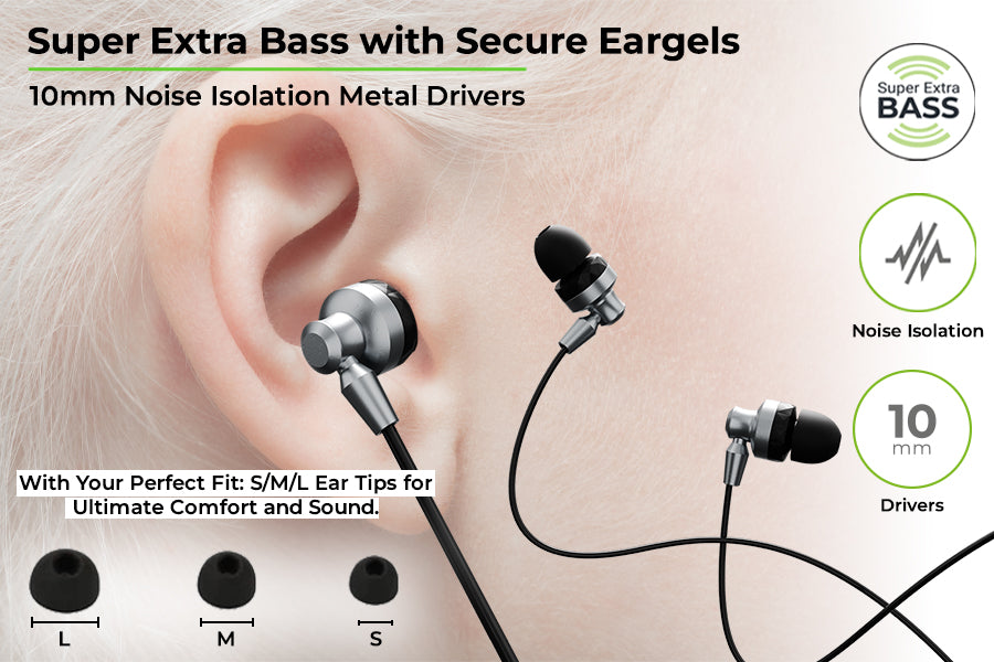 Immerse yourself in an unparalleled audio experience with in-ear wired earphones designed for bass enthusiasts. The Super Extra Bass technology amplifies your favorite tracks with deep, rich, and punchy beats, while the ergonomically designed eargels ensure a snug fit. These eargels not only enhance comfort but also lock in the sound, keeping external noise at bay. Whether you're commuting or working out, enjoy distraction-free music with these wired earphones with mic. Spare gels of different sizes provided in the box to suit different needs.
