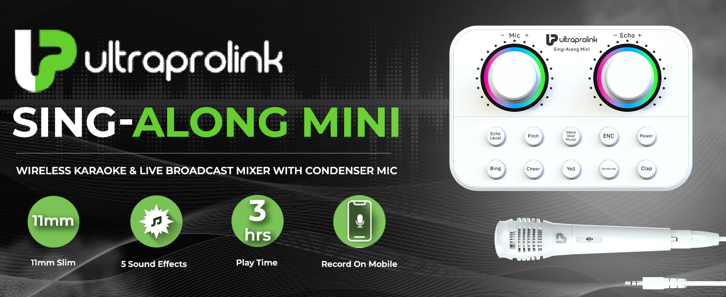 Sing-Along Mini – The ultra Slim Wireless Karaoke Mixer with condenser mic can be used by amateurs & professionals both at home or in a studio setup. It can be connected to portable speakers or large amplifiers for better effects. Its digital DSP chip supports all live broadcast platforms, popular music apps & operating platforms such as Mac OS, Windows & Android. Now Go Live, enjoy singing or simply broadcasting your content to the world. Record & be able to edit your content as well. Convert any speaker with a line input into a karaoke machine.