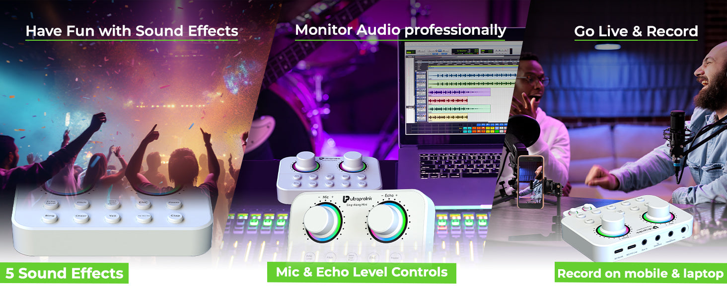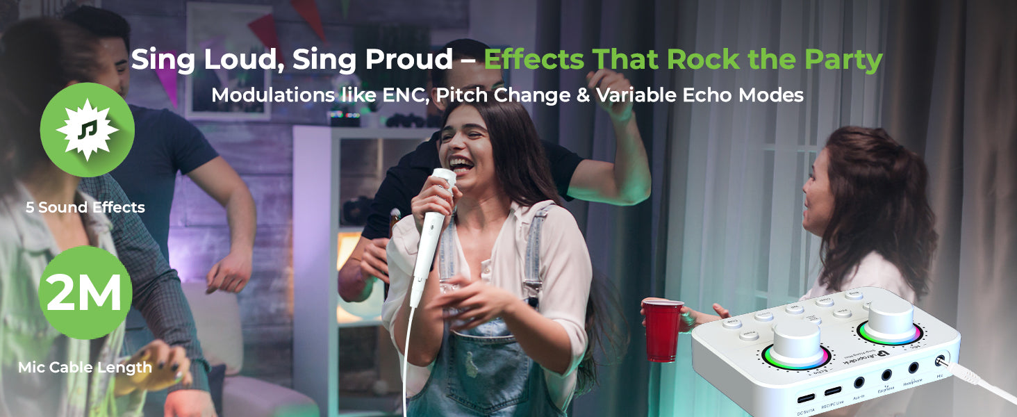 Customize your sound with Echo Controls for professional-quality audio. Enjoy 5 sound effects like Clap, Cheer, Laughter, Bing & Yell, to enhance creativity and excitement in your performances. The upda Pro-Users can use functions like pitch change, ENC & monitor their sound via earphones or headsets .