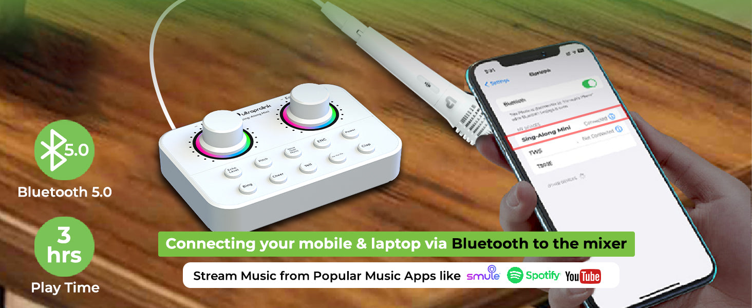 Sing-Along Mini connects easily to iPhones, Android phones, Laptops, PCs & tablets. It works well with all popular operating systems like iOs, Windows & Mac OS. Enjoy up to 3 hours of playtime with the built-in rechargeable battery. Recharge the mixer in 1-1.5 hours via the Type C port.