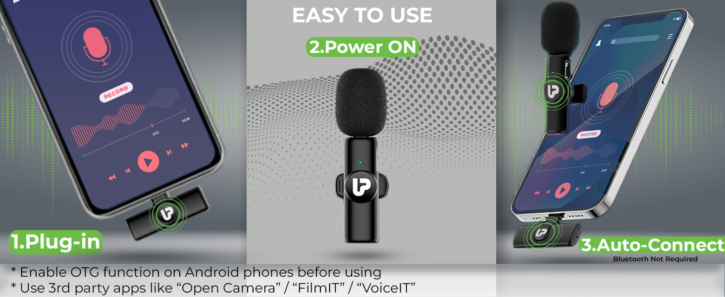 Includes a universal Type C connector and Type C to iPhone converter plug, ensuring seamless compatibility with iPhone, iPad, Android smartphones, and tablets with USB C ports (supports OTG function). Tip: Enable OTG function on Android phones before using. Use 3rd party apps like “Open Camera” / “FilmIT” / “VoiceIT” if your device doesn’t support mic recording or the inbuilt camera app doesn't support external mics.