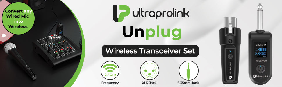 Now with the UltraProlink UnPlug setup, easily transform any wired dynamic microphone into a wireless mic with this compact, plug-and-play adapter set. Operating on the reliable 2.4GHz band, it requires no software or apps—just connect and go. With an impressive range of up to 30 meters (98 feet), it’s perfect for events, performances, or presentations. The built-in rechargeable batteries provide 4–5 hours of continuous use and conveniently recharge via Type-C ports. Designed for wide compatibility, it works seamlessly with dynamic microphones, PA systems, sound mixers, and party speakers.