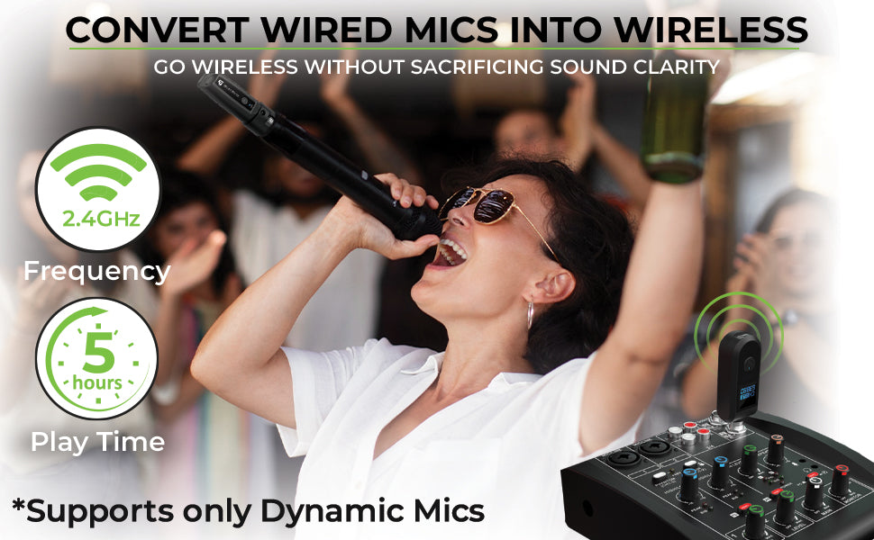 Enjoy crystal-clear sound with 2.4GHz technology, providing reliable, stable, low lag, high-quality audio for dynamic mics with minimal interference. This frequency offers minimal interference.