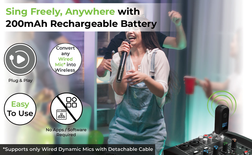 Unplug is very easy to use. No complicated apps to download or any fine tuning to be done. Just plug in & power on & the Tx-Rx will connect to each other. Works seamlessly with popular dynamic microphones such as Shure, AKG,Digimore, Sennheiser, Maono, Ahuja,JBL, Tonor & public address systems like Ahuja, JBL, audio mixers such as UltraProlink, Audio Array, hayden,Ahuja, providing wireless connectivity for musicians, DJs, and live performers.