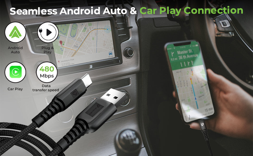 This fast charging Type C Cable Seamlessly connects with cars equipped with wired Android Auto & Car Play. Just plug into the compatible car USB port & it will automatically detect & connect to your car system. Access your device content , Navigation & communication on your car screen.