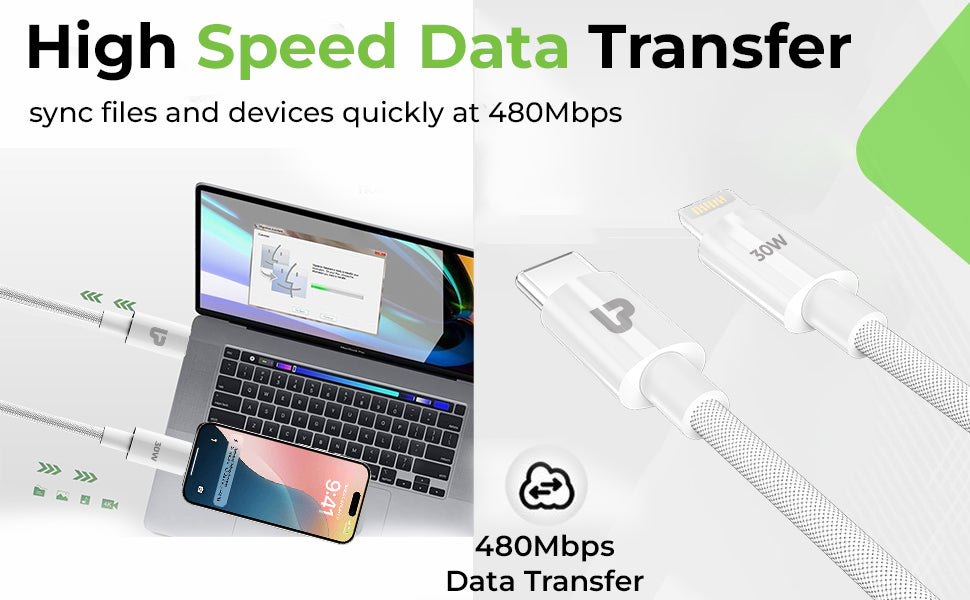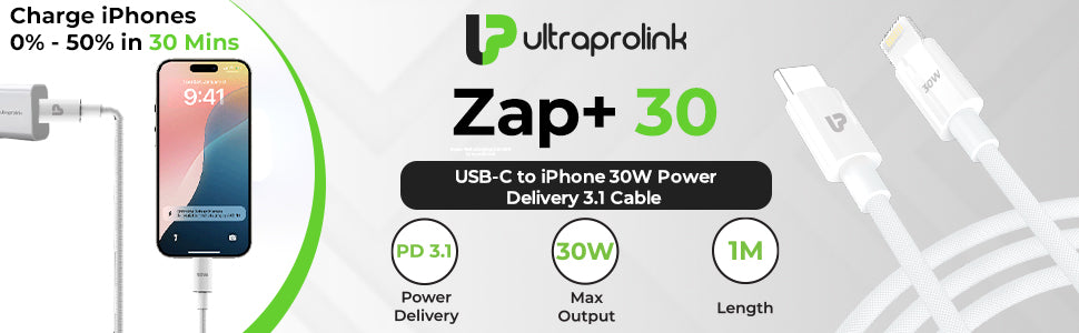 Introducing the UltraProlink Zap+ 30, a 30W USB-C to iPhone PD fast charging cable, designed for the modern tech-savvy user. This durable, nylon-braided cable is your ultimate companion for powering up iPhones & iPads at super speeds. Engineered for fast, easy charging, the UltraProlink delivers up to 30W of power, ensuring your devices like iPhone 14/13/12/11 & earlier & iPads reach full battery swiftly. With USB 2.0 compatibility, enjoy data sync speeds of 480mbps, making file transfers quick and efficient. Its robust design is bend-tested 25,000 times, promising longevity and reliability. Whether you're charging your latest iPhone or syncing data between devices, this cable's universal USB-C interface guarantees wide compatibility and ease of use. Backed by a 6-month warranty, the UltraProlink Zap+ 30 is the perfect blend of speed, durability, and compatibility, making it an essential accessory for all your charging and data transfer needs.