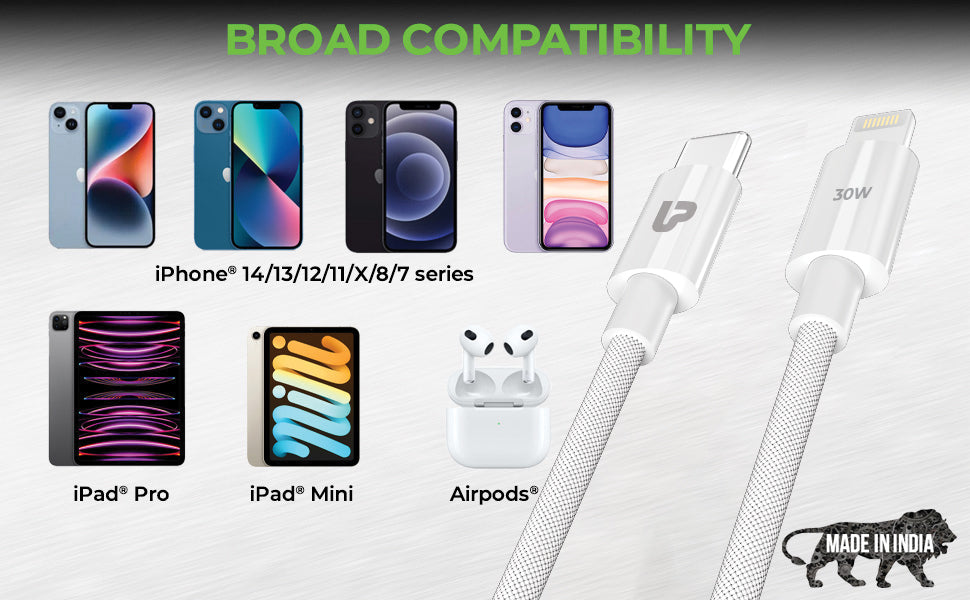 Connect universally with idevices iPhones 14/13/12 & iPads to charge 50% in 30 mins when used with a PD fast charger.