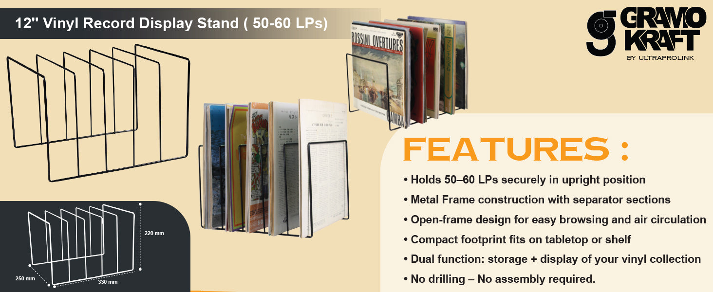 Organize, protect, and beautifully showcase your vinyl record collection with the GramoKraft Vinyl Record Display Stand. Crafted from a single piece sturdy metal wire brace with an open-frame design, this album rack holds 50 to 60 LPs — ideal for both casual listeners and dedicated collectors. The open sides allow easy browsing and access, while the base supports your records upright and prevents warping. Its compact footprint makes it perfect for placing on a table top or shelf. The minimalistic design complements any décor style — from modern to vintage — and keeps the focus on your album covers.