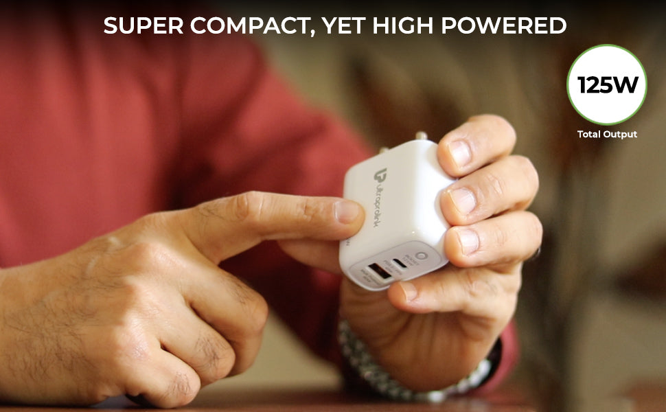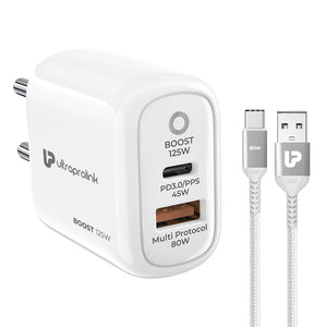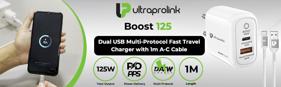 Maximize your charging efficiency with the UltraProlink Boost 125 Fast Charger, the ultimate solution for powering up your devices swiftly and safely. This robust charger features dual USB ports, including an 80W USB-A and a 45W USB-C port, each optimized with Multi-Protocol support for efficient power delivery. The included 1m USB-A to USB-C cable supports up to 80W SuperVooC charging, perfect for rapid charging wherever you are.. Its compact design does not compromise on safety, incorporating multiple layers of protection against common electrical threats. Made in India, this charger is not only reliable but also supports local industries. With a 6-month warranty, it stands as a testament to our commitment to quality. Ideal for travelers and tech enthusiasts alike, the UltraProlink Boost 125 ensures your devices are always ready to go.