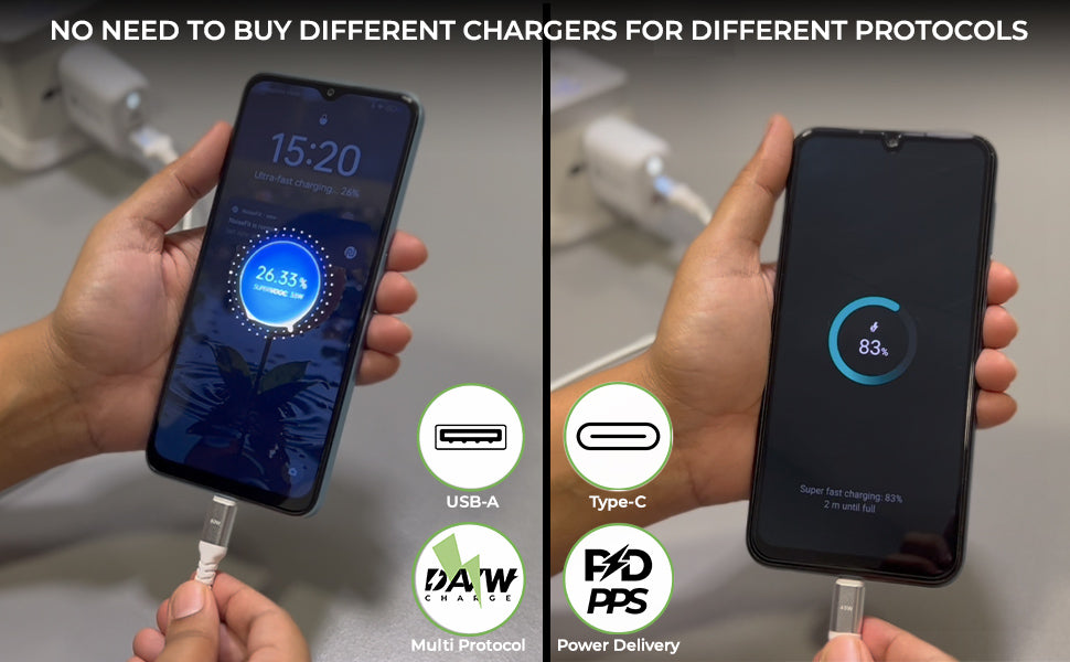 This versatile USB Charger supports various fast charging technologies such Dash-Warp,SuperVooc, FCP,SFC, making it compatible with devices like OnePlus 12/12R11/11R/10T, Realme 12/11/GT , Xiaomi 13/12/A2/A1, Oppo F25 Pro/Reno11/Reno11 Pro/Find N3 Flip and others, perfect for users with multiple device types.