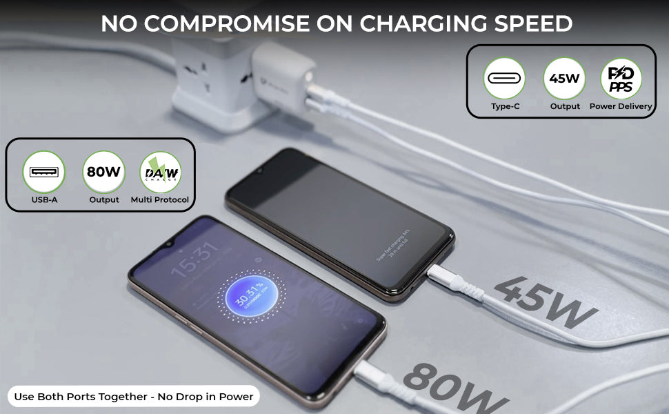 This Multi-Device Charger incorporates a unique Dual PCB design, ensuring dedicated and safe power distribution to each port, ensuring there is no compromise on charging speed even when both ports are used together, unlike other chargers where the power gets split between ports.