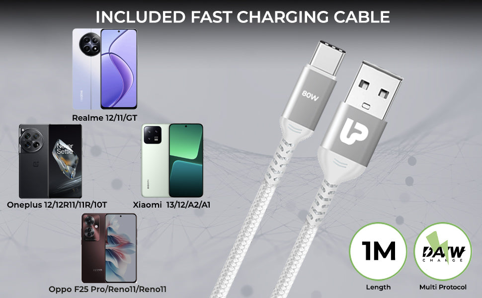 Each charger comes with a 1m USB-A to USB-C Fast Charging Cable, capable of supporting up to 80W, ideal for meeting your quick charging needs efficiently.