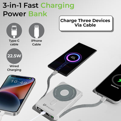 The 3-in-1 Magnetic Wireless Power Bank is the ultimate charging solution for iPhones, iWatch, AirPods, and more. Featuring Mag-Safe technology, it delivers 15W fast wireless charging for iPhone 16, 15, 14, and 13 series, ensuring a secure magnetic connection for uninterrupted power. It also supports 2.5W wireless charging for iWatch and 5W for AirPods, making it a must-have for all your iEssentials. With a high-capacity 10000mAh battery, this power bank provides multiple charges, keeping your devices powered throughout the day.