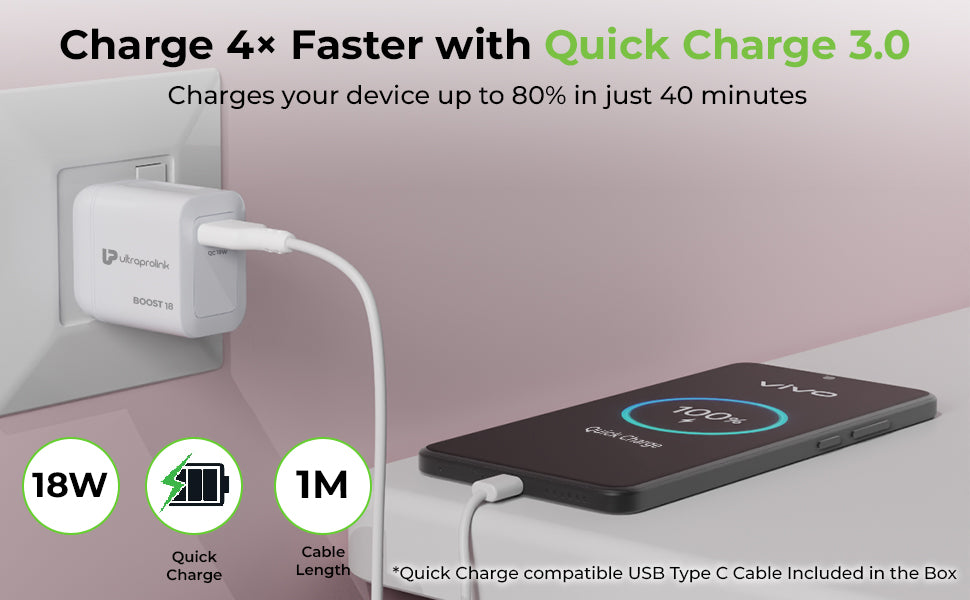 When using the Qualcomm Quick Charge 3.0 port, your connected device will charge 4x faster than any ordinary charger – allowing your device to reach as much as 80% of their full charge capacity in just 35 minutes. BOOST QC comes with a quick charge compatible USB Type C Cable (1m).