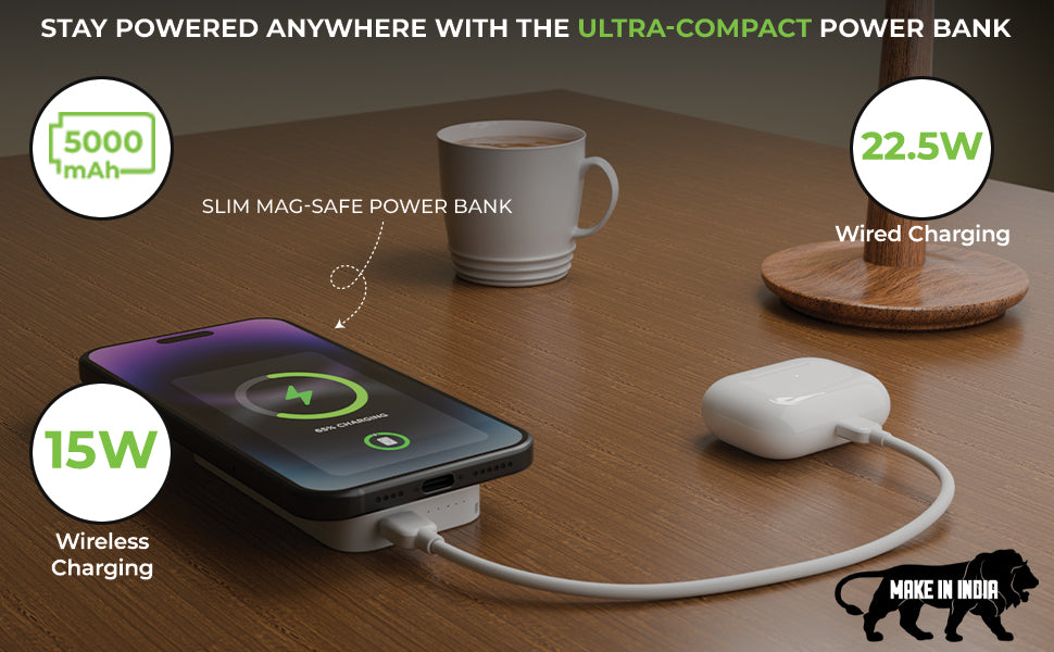 Lightweight mag-safe power bank 5000mAh (5000+ mAh actual) with 22.5W fast charging; functions as a wireless power bank for iPhone and Android devices, keeping you powered anywhere.