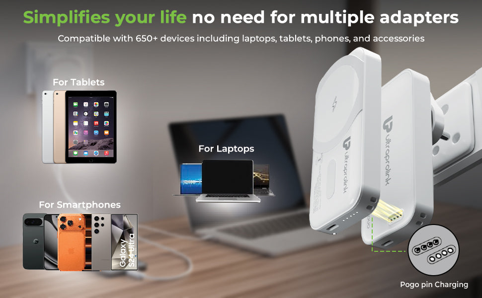 PD 3.0 & USB-C at 22.5W port enables power bank fast charging with PD/PPS protocols; charger supports laptops, tablets, mobiles & 650+ devices with multi-protocol fast charging including QC3.0 & Samsung SFC 2.0. Charge iPhones & Pixels 0% to 50% in 30 mins.