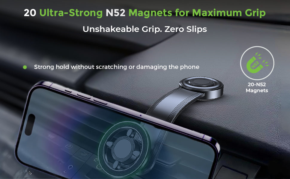 Built with 20 powerful N52 magnets, this MagSafe car mount delivers superior magnetic strength to keep your phone secure—no slips, no shakes, even on bumpy roads. A top choice for those seeking a strong magnetic phone holder for car dashboards.