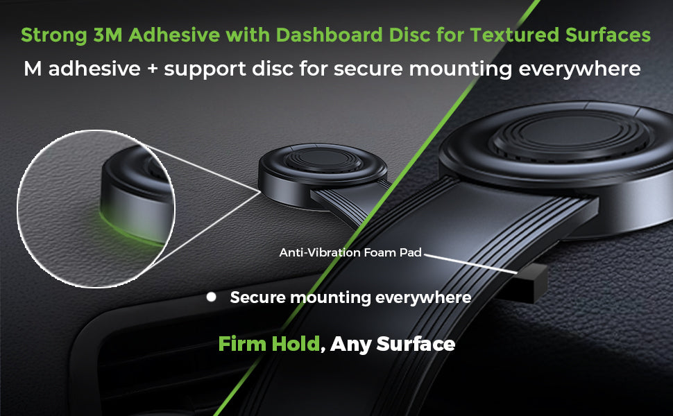 This dashboard phone mount features an industrial-grade 3M tape along with a textured-surface support disc to ensure a secure mount on any car dashboard, whether flat or uneven. {Clean the surface & ensure dust-free before sticking the base.