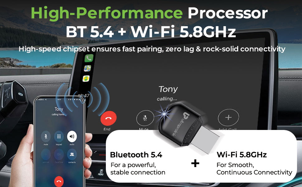 Powered by an advanced high-speed chipset, DriveLink delivers lag-free wireless CarPlay and Android Auto performance. The integrated latest standard Bluetooth 5.4 + 5.8GHz Wi-Fi module ensures faster pairing, stable connections, and uninterrupted playback even during long drives.