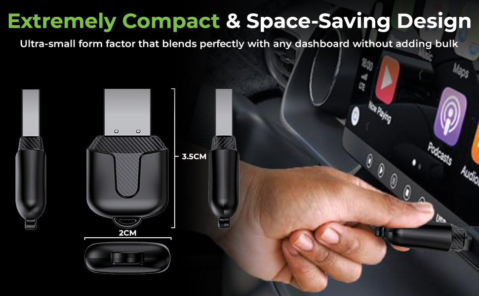 Transform your existing wired Android Auto or Apple CarPlay system into a fully wireless experience. The UltraProlink DriveLink wireless car adapter connects via your car’s OEM USB port, eliminating the need for cables. Enjoy instant hands-free connectivity for navigation, music, and calls — perfect for modern, clutter-free driving. Note : This product is Only for Cars with OEM Pre-Installed Wired Android Auto & CarPlay. Limited models of BMW support wired CarPlay & Android Auto – Kindly verify this in your car manual. Designed with minimalism in mind, this 2-in-1 wireless car receiver features a sleek, compact form factor that blends seamlessly into your dashboard. Its lightweight build ensures easy portability while maintaining a premium aesthetic fit for any vehicle.