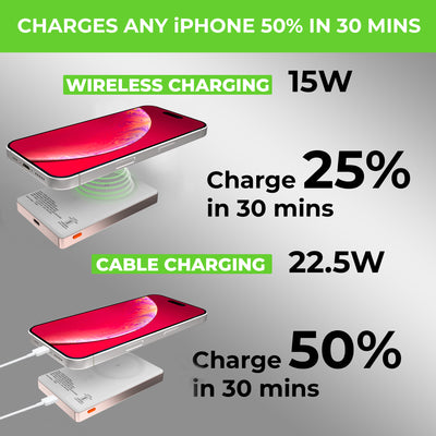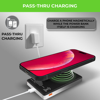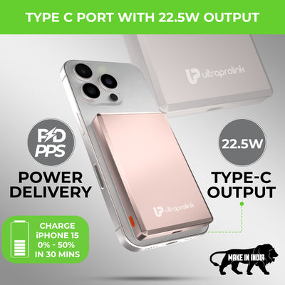 Elevate your wireless charging game with UltraProlink Juice-Up Mag 4, the ultimate Sleek Wireless Magnetic Power Bank for your new iPhone. With a 10000mAh capacity and 22.5W Type-C output, it supports PD & PPS protocols via cable charging & 15W wireless charging, ensuring rapid, efficient charging. 15W Mag-Safe compatibility for iPhone 16,15,14,13,12, and wireless charging for other devices like Samsung, OnePlus, and Google Pixel, make it incredibly versatile. Its ultra-Slim design (13.7mm) includes a premium brushed aluminium metal body, while the LED display keeps you informed of your power status. Portable and powerful, it’s perfect for on-the-go use. Proudly Made in India, this compact powerhouse comes with a 6-month warranty, ensuring quality and satisfaction. Charge your iPhone from 0% to 50% battery in 30 mins.