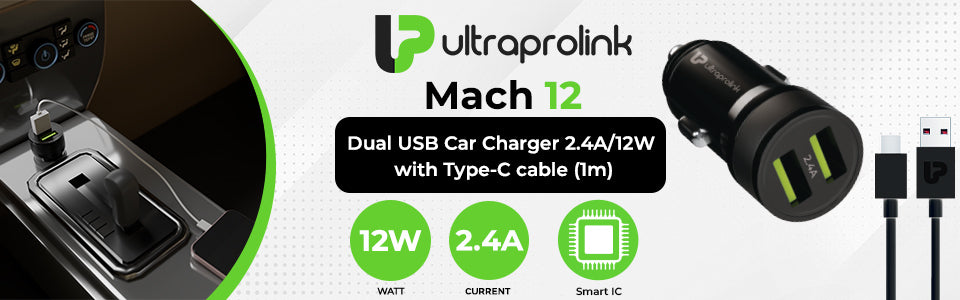 The UltraProlink Mach 12 / UM1239 is a compact yet sturdy USB Car charger. It can simultaneously power two devices - including two Smartphones - thanks to the combined 2.4A output. A fast charge Type C cable (1m) is provided in the box. Irrespective of battery voltage, the Mach 12 will automatically adjust to protect your device and charge at a steady rate.