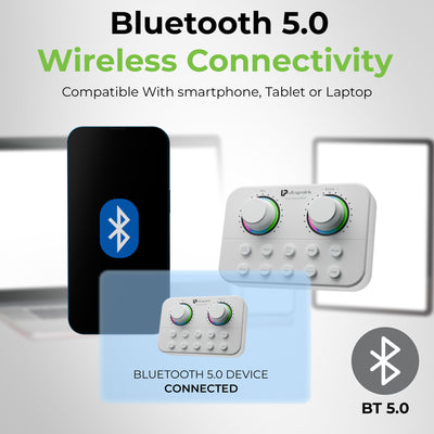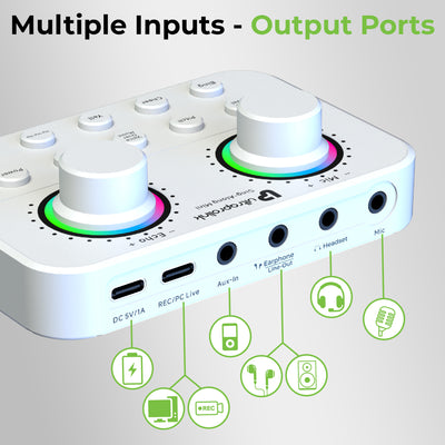 Easily play tracks or go live by connecting your mobile & laptop via Bluetooth to the mixer. Connect your mobile device to the mixer interface for karaoke or live broadcasting via latest Bluetooth 5.0. Alternatively use the 3.5mm audio cables provided in the box to connect upto two devices with cable to play content from different sources. Perfect for using with Apps like Tik-Tok, Smule, Youtube, Instagram.